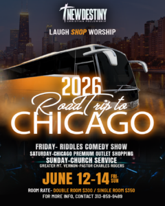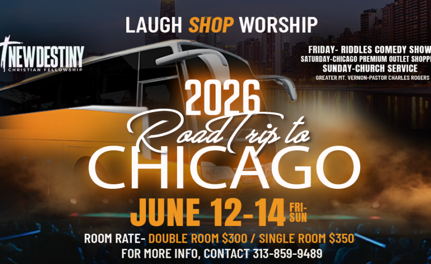 12 Jun 2026 2026 Road trip to Chicago 0 June 12, 2026 newdestiny 12 Views 0 Likes Map Unavailable Date/Time Date(s) - June 12, 2026 - June 14, 202612:00 am Categories No Categories